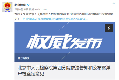 6月30日,北京市人民檢察院第四分院向雷洋死亡案件涉案警務(wù)人員及其家屬、雷洋家屬及雙方聘請的律師依法告知了雷洋尸檢鑒定意見。